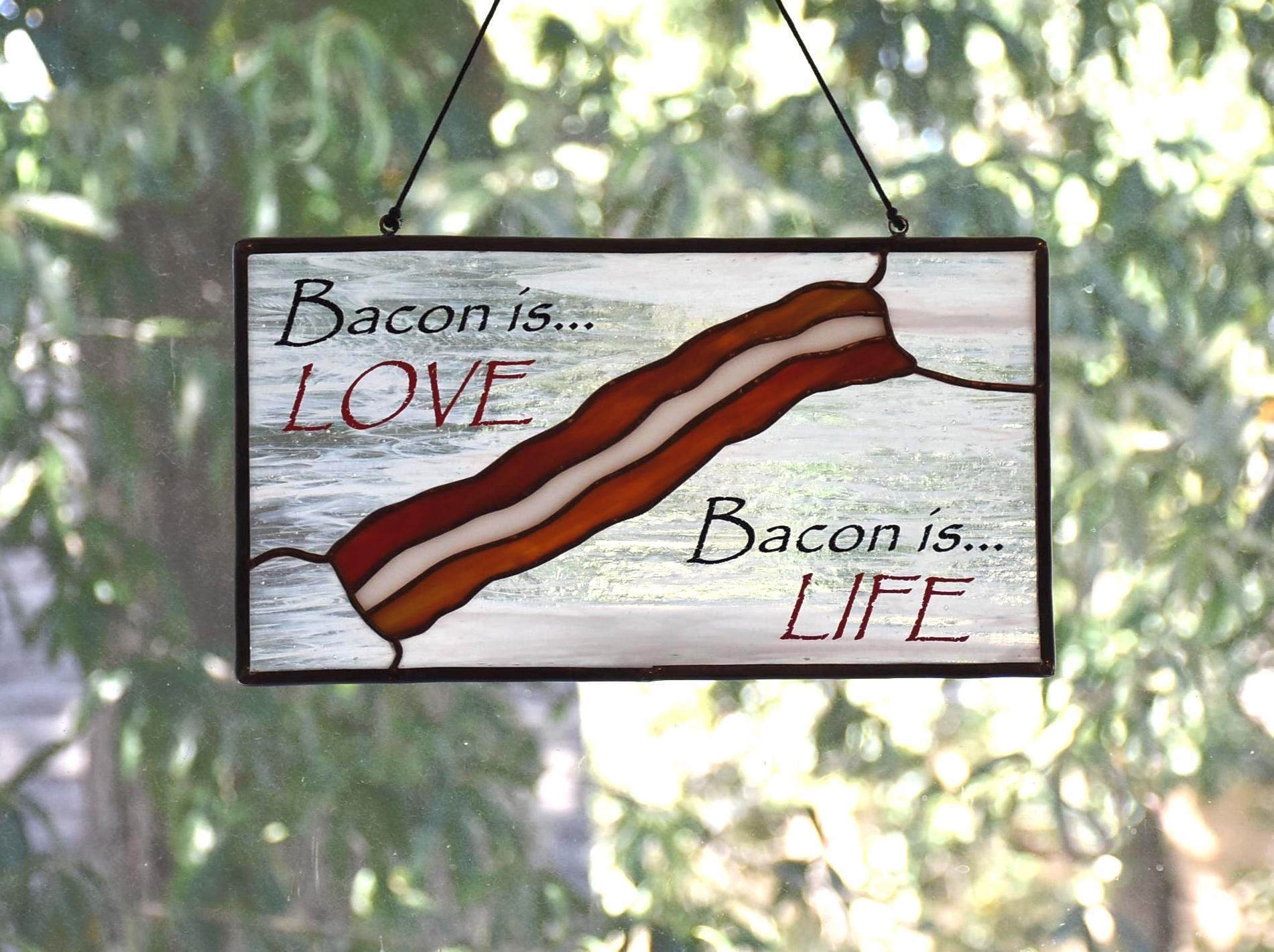 Custom designed and crafted stained glass art "Bacon is Love...Bacon is Life". Features hand-made glass, copper patina and weather-resistant vinyl lettering. Complete and ready to hang in your favorite window or give it as a gift to the special bacon-lover in your life! Who doesn't love bacon?!