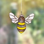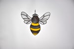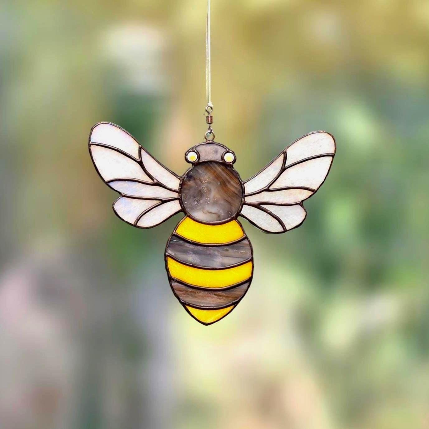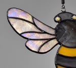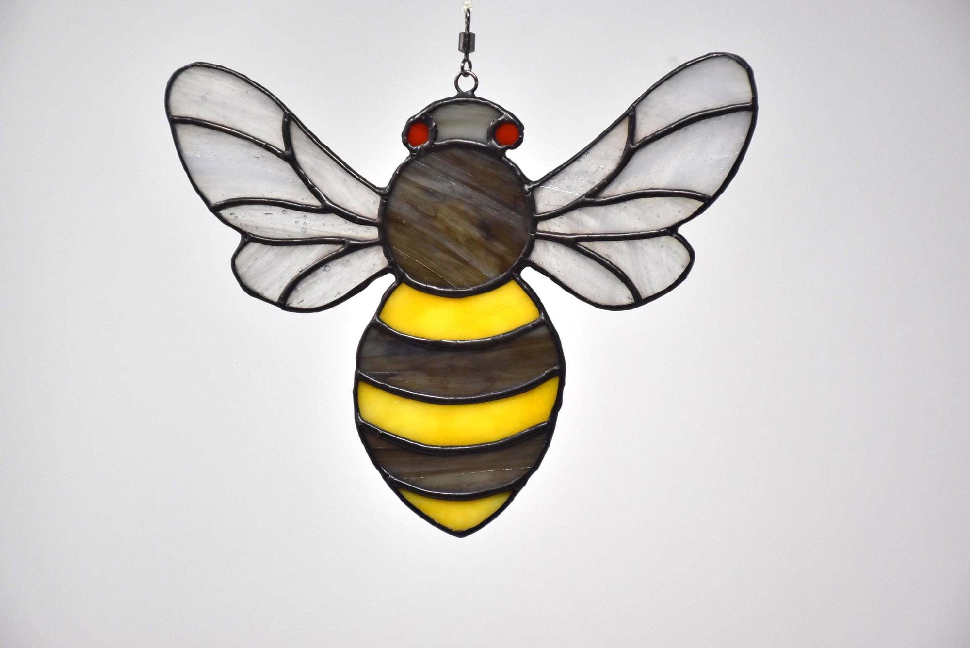 Beautiful custom designed and crafted stained glass art "Barry the Bee" suncatcher. Features hand-made glass, iridescent glass wings on one side and dark patina. It's a spinner! One side has yellow miniature "googly" eyes, the other side is plain - cute and fun! Complete and ready to hang in your favorite window or give it as a gift to that special person in your life!