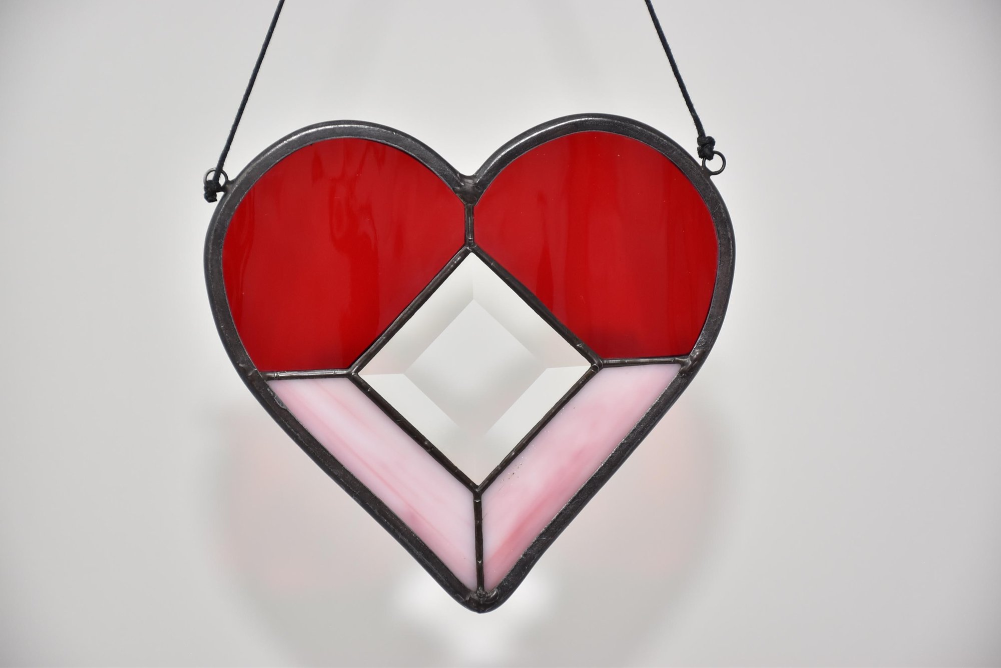 Beautiful custom designed and crafted stained glass art "Heart with Bevel Glass Center" suncatcher. Features hand-made vibrant red and pink glass with a special bevel center and dark patina. Complete and ready to hang in your favorite window or give it as a gift to that special person in your life to let them know how you feel!
