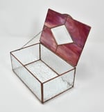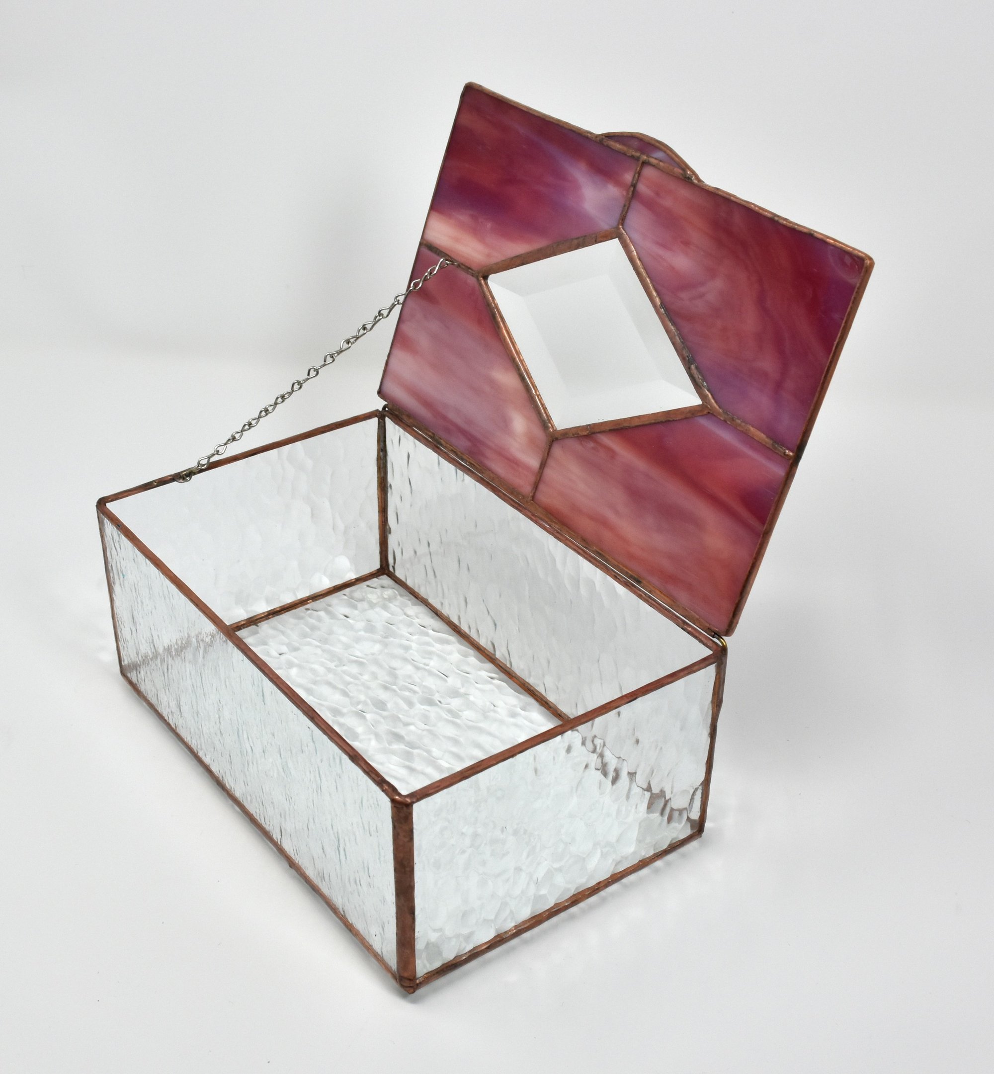 Beautiful custom designed and crafted stained glass art "Red Box with Bevel Diamond Center". Features hand-made vibrant red hand-rolled glass with a special diamond-shaped bevel center and copper patina. Complete and ready to hold your special keepsakes or give it as a gift to that favored person in your life to let them know how you feel!